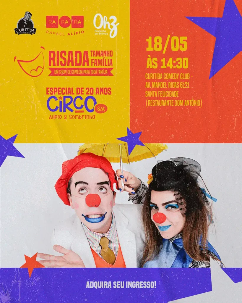A apresentação especial de aniversário do Circo S/A será realizada no dia 18 de maio, sábado, às 14h30, no Curitiba Comedy Club. Os ingressos já estão à venda e podem ser adquiridos online no site https://bileto.sympla.com.br/event/83076 .
