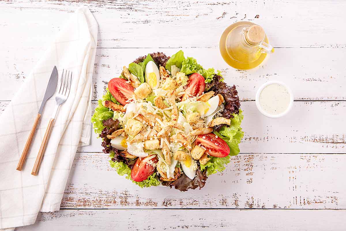 Para fechar o tour, a Salada de Frango que leva sua receita: queijo parmesão, três tipos de alface, rúcula, tomate, ovos cozidos, e croutons crocantes, sem esquecer do molho é claro. Oferecendo uma refeição completa e saborosa para quem não dispensa a proteína animal mas prefere algo mais leve que o mignon.