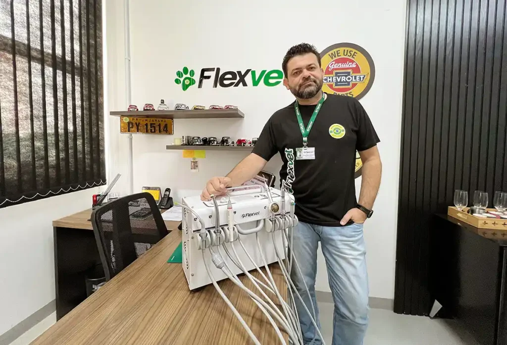 Vi que existia um nicho que não era atendido e que, principalmente quando falamos de animais de grande porte, é mais fácil levar o consultório odontológico até eles do que o contrário. Hoje, temos 17 modelos entre móveis e modulares, e agora também a mesa cirúrgica, equipada com tudo o que é necessário para a realização de cirurgias odontológicas“, conta Júnior, criador da FlexVet