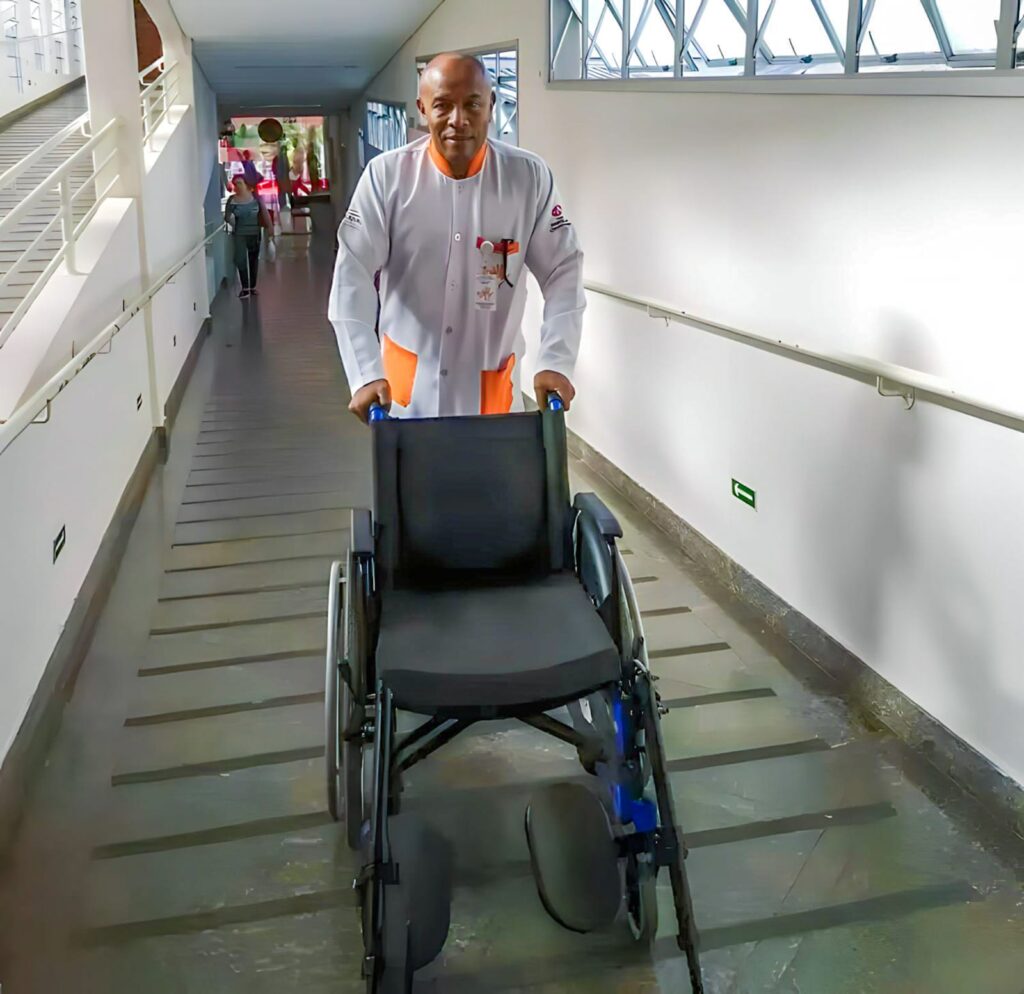Prática regular de exercícios físicos prepara Ribeiro para conduzir macas e cadeiras de rodas no hospital. (Foto: Arquivo pessoal)
