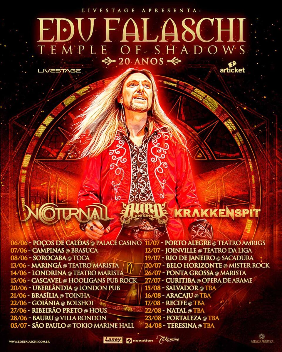 Em comemoração ao lançamento oficial do DVD “Temple Of Shadows In Concert” e aos 20 anos do icônico álbum Temple of Shadows, Edu Falaschi, uma das vozes mais marcantes do heavy metal mundial, embarca em uma turnê histórica pelo Brasil em 2025. A produção da turnê é da Live Stage. Entre os meses de junho e agosto, a Temple of Shadows in Concert Tour 2025 levará aos fãs um espetáculo memorável, que une a música poderosa do álbum ao refinamento de apresentações com orquestra sinfônica e convidados especiais. O áudio do DVD “Temple Of Shadows In Concert” estará disponível em todas as plataformas a partir do dia 18/12.