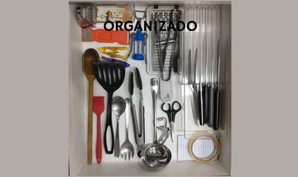 6. Talheres: Separando por itens de medição (colheres medidoras), preparo (facas e descascadores de legumes), cocção (colheres e espátulas de silicone, colheres de pau) e servir (conchas, pegador de sorvete ou salada) é fácil definir o melhor lugar para organizá-los. Os de preparo e medição perto da pia, os de cocção perto do fogão e os de servir perto da mesa das refeições. Na organização tudo é pensado para agilizar os processos!