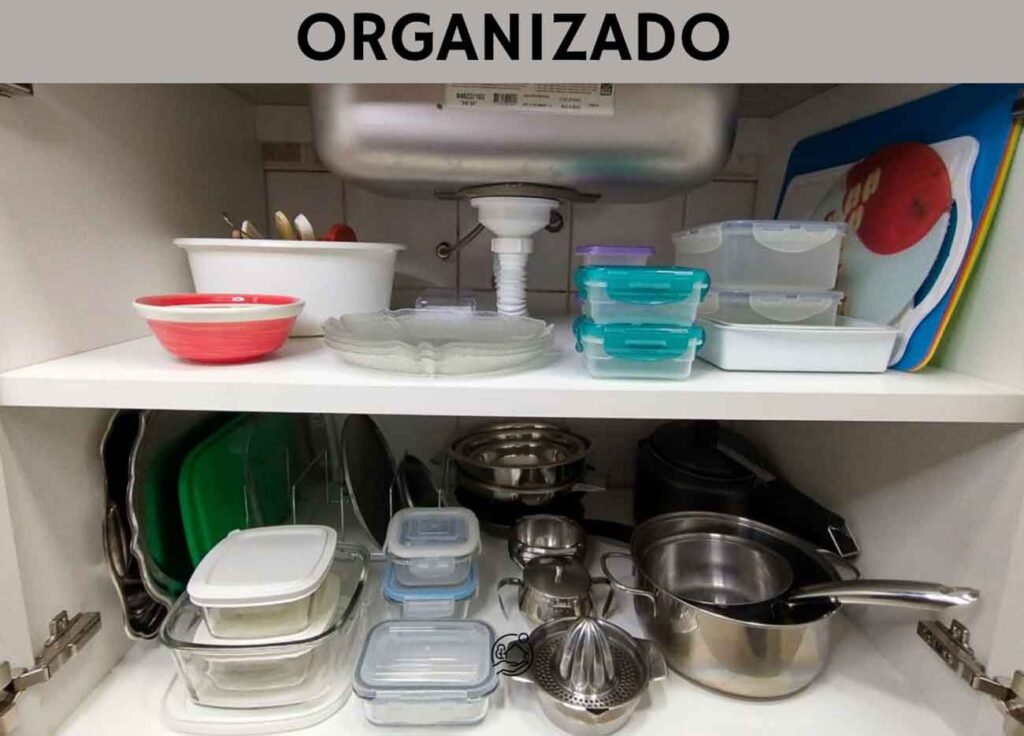 2. Panelas: O melhor lugar para guardar as panelas utilizadas no dia a dia é o armário embaixo da pia. Como nem sempre é possível evitar que sejam empilhadas, o ideal é colocar um protetor entre elas para evitar arranhões que comprometem, principalmente, as panelas antiaderentes. Já as tampas podem ser organizadas da maior para a menor em uma caixa de plástico, por exemplo.