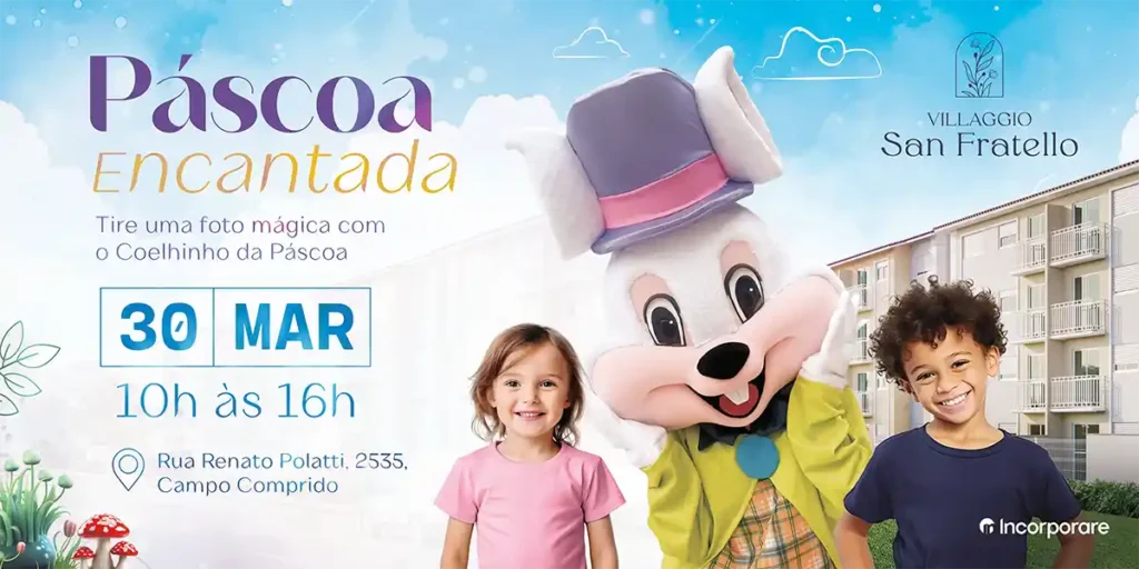 Se o feriado de Páscoa para muitas famílias é momento de viajar e curtir a folga, para quem fica em Curitiba e Região Metropolitana programação não falta. E uma delas é aproveitar o momento festivo da data. Por isso, no próximo dia 30 de março (Sábado de Aleluia), no Villaggio San Fratello, que fica no bairro Campo Comprido, na capital, acontecerá a “Páscoa Encantada”. Será um evento totalmente gratuito que irá receber pais, responsáveis e crianças, das 10h às 16h. As inscrições já estão abertas!