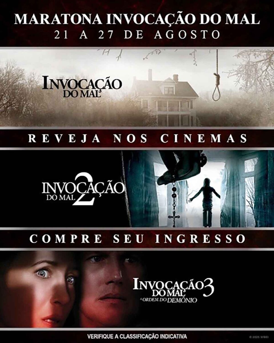 Fãs de terror já podem se preparar para reviver as histórias que assombraram gerações. A Warner Bros. Pictures Brasil acaba de anunciar o retorno dos três primeiros filmes de Invocação do Mal às telonas, em uma maratona especial entre os dias 21 e 27 de agosto. As sessões antecedem o aguardado lançamento da conclusão da franquia, Invocação do Mal: O Último Ritual, que chega aos cinemas em 04 de setembro. A pré-venda para as reexibições da franquia já está disponível.