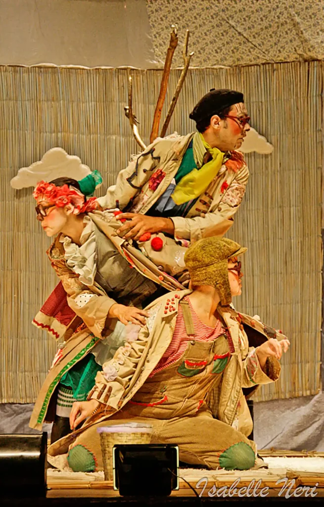 Sinopse – Apresentamos dois contos adaptados da literatura clássica infantil “Chapeuzinho Vermelho e Os Três Porquinhos”, uma comédia irreverente que busca a cumplicidade do espectador por meio de estripulias teatrais com a linguagem circense. Quatro palhaços abrem o espetáculo tocando uma charanga, apresentam os palhaços, logo em seguida o apresentador anuncia a primeira história que será encenada pelos próprios palhaços, Chapeuzinho Vermelho. A encenação é conduzida com a intervenção do narrador que comanda as ações no palco de forma divertida para que a história envolva quem assiste, além de executar os sons incidentais e as músicas que são cantadas pelos palhaços. Logo após finalizar a primeira história o narrador anuncia a segunda dramatização, Os Três Porquinhos, que são interpretados por dois palhaços, o terceiro porquinho é lembrado na história, como referência do trabalhador que desfruta as férias por ter realizado seu trabalho com mais rapidez. Com irreverência os dois porquinhos propõe para a dramatização uma reflexão sobre a moral e ética de trabalho e se vale a pena nos dedicarmos exclusivamente ao trabalho, deixando de lado outras coisas importantes, buscamos que, desse modo, haja uma reflexão dos espectadores em meio a sua própria vida e convívio.