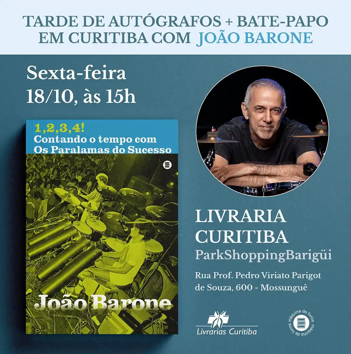 Em 1,2,3,4! Contando o tempo com Os Paralamas do Sucesso (Editora Máquina de Livros) que será lançado dia 18 de outubro na Livraria Curitiba do ParkShoppingBarigüi, com direito a um bate-papo antes da sessão de autógrafos, Barone faz um mergulho na trajetória da banda, com desconcertante sinceridade e uma incrível riqueza de detalhes. Ele busca na infância simples o fascínio pela bateria e lembra os primeiros passos ao lado de Herbert Vianna e de Bi Ribeiro no início dos anos 80, antes da fama: os ensaios na casa da Vovó Ondina, as tardes com os amigos na Praia de Ipanema, a gravação da demo que virou sensação na Rádio Fluminense FM…