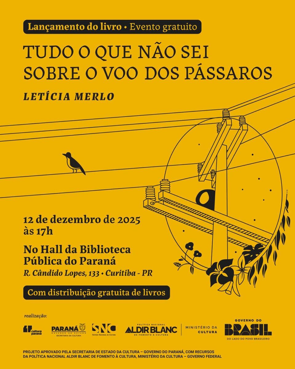 O projeto “Tudo o que não sei sobre o voo dos pássaros” pretende publicar e distribuir gratuitamente o livro homônimo em bibliotecas de escolas públicas e das 16 Casas da Leitura de Curitiba. A obra, escrita, escrita pela autora Letícia Merlo natural de Caxias do Sul – RS, e graduada pela Universidade Estadual do Paraná, foi contemplada com o Prêmio Carolina Maria de Jesus, o maior reconhecimento da literatura feminina do país, lançado pelo Ministério da Cultura em dezembro de 2023.