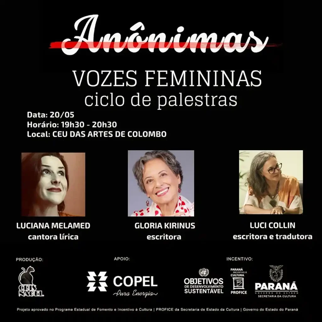 A escritora e tradutora Luci Collin, a autora Glória Kirinus e a cantora lírica Luciana Melamed realizam mais uma edição do Ciclo de Palestras Vozes Femininas. O evento acontece hoje (20 de maio), das 19h30 às 20h30, no CEU das Artes e Esportes Unificados de Colombo e a entrada é franca.