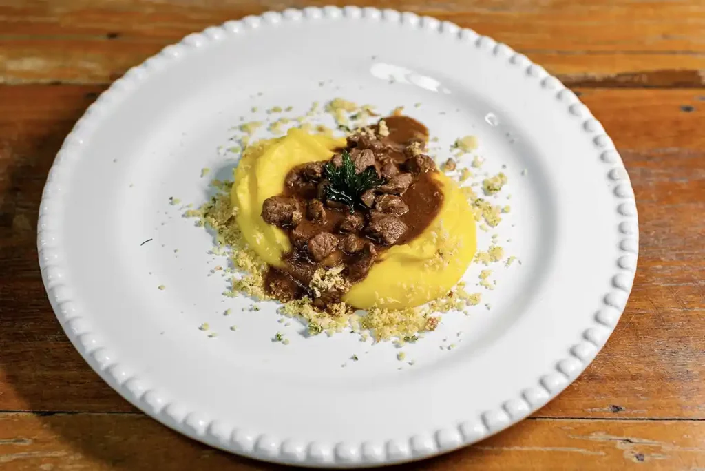 ✔  Polenta com ragú de costela e crumble de grana padano. Com proteína animal e leite.