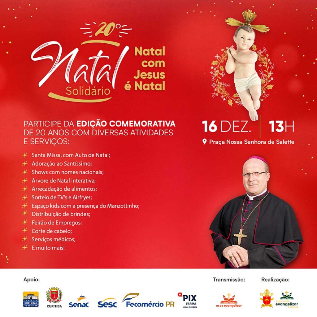 A programação religiosa e cultural do Natal Solidário deste ano terá início às 13h, com atividades recreativas para as crianças – com a presença do personagem Manzottinho -, Terço de Jesus das Santas Chagas e Adoração. Às 17h, a Santa Missa será presidida pelo Arcebispo de Curitiba, Dom José Antônio Peruzzo.