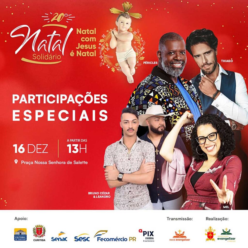 O 20º Natal Solidário da Associação Evangelizar É Preciso terá, entre as participações especiais, o cantor, compositor e instrumentista de samba e pagode, Péricles. Também estão confirmadas as apresentações do tenor Thiago Arancam e da cantora curitibana Mel Fernandes, que representou o Paraná no The Voice Brasil 2022.