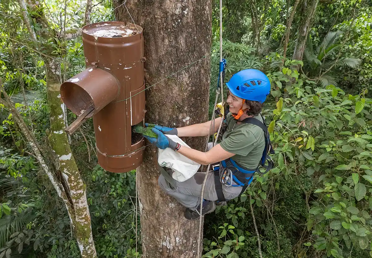 Implementado em 1998 no litoral norte do Paraná e executado desde 2013 também no litoral sul de São Paulo, o Projeto de Conservação do Papagaio-de-cara-roxa da SPVS contribui para a conservação da espécie no seu habitat natural, a Mata Atlântica, em consonância com o Plano de Ação Nacional (PAN) de Conservação dos Papagaios até 2023 e, atualmente, com o PAN das Aves da Mata Atlântica.