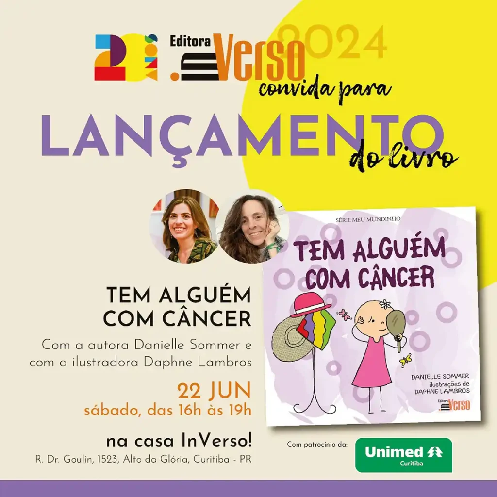 Um título forte para um livro que tenta explicar às crianças um momento desafiador para a família. No próximo dia 22 de junho, das 16h às 19h, a autora Danielle Sommer e a ilustradora Daphne Lambros lançam o sexto livro juntas: “Tem alguém com câncer“. A sessão de autógrafos será na casa da Editora InVerso (Dr. Goulin, 1523, Alto da Glória – Curitiba – PR).