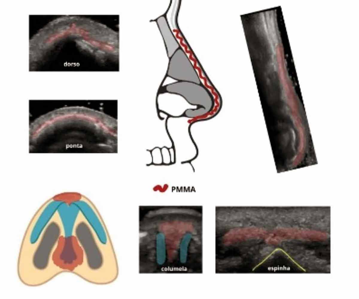 “A primeira coisa que solicitei foi um ultrassom da região do nariz para avaliar e localizar onde está o PMMA, qual a quantidade existente, em que posição o produto estava e qual a sua integração com a pele“, relata. Segundo ela, a paciente tinha produto grudado nos tecidos e infiltrado até mesmo no músculo da boca.